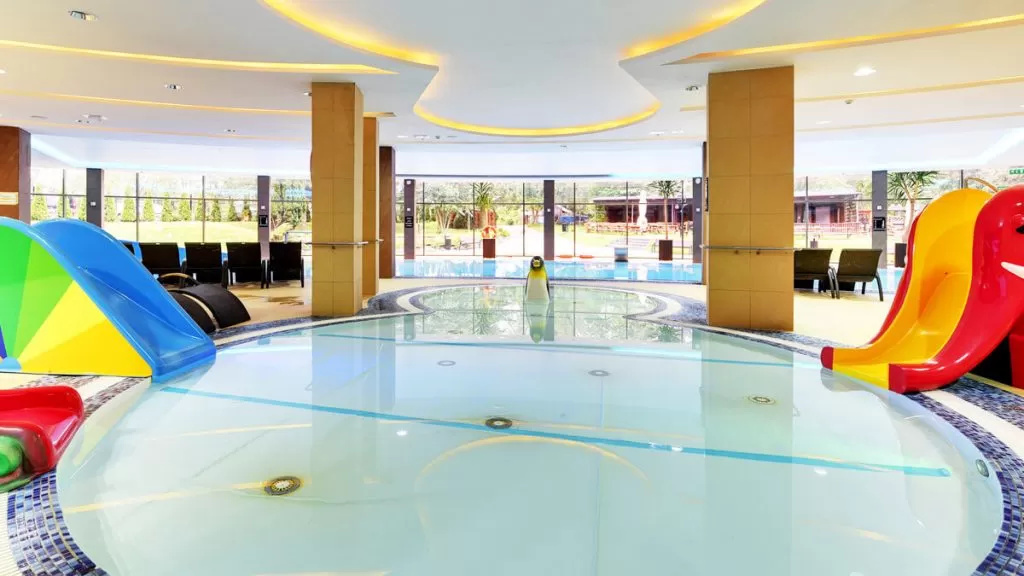 Rodziny z dziećmi nie będą się tutaj na pewno nudzić. Na dwóch hotelowych kondygnacjach mieści się kompleks wodny z 4-torowym basenem sportowym, rekreacyjnym zbiornikiem ze zjeżdżalnią, sztuczną rzeką i podwodnymi leżankami. Małe dzieci znajdą wspaniałą zabawę w specjalnym brodziku, a rodzice z pewnością docenią bogatą strefę Wellness. Dodatkową atrakcją wodną jest basen zewnętrzny. Poza basenem rodziny mają do dyspozycji 4-torową kręgielnię, wielofunkcyjne boisko sportowe, wypożyczalnię rowerów i ogromne zaplecze rozrywki dla dzieci, na które składają się nowoczesne konsole multimedialne, edukacyjne gry i fantastyczny małpi gaj.